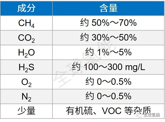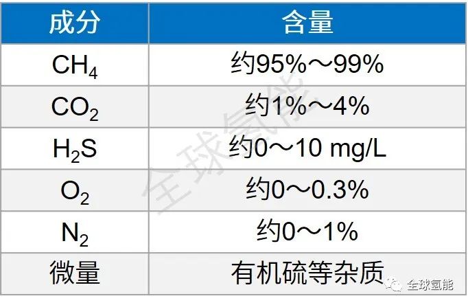 沼氣的主要成分如圖所示,沼氣經過凈化提純后可以得到甲烷濃度為95%以上的生物甲烷,能夠替代常規天然氣用作民用燃料或工業用途。沼氣制氫工藝包括水蒸氣重整法制氫、干重整法制氫、部分氧化重整法制氫、自熱重整法制氫、催化裂解法制氫和化學鏈重整制氫等。各種工藝簡單對比如下圖所示。