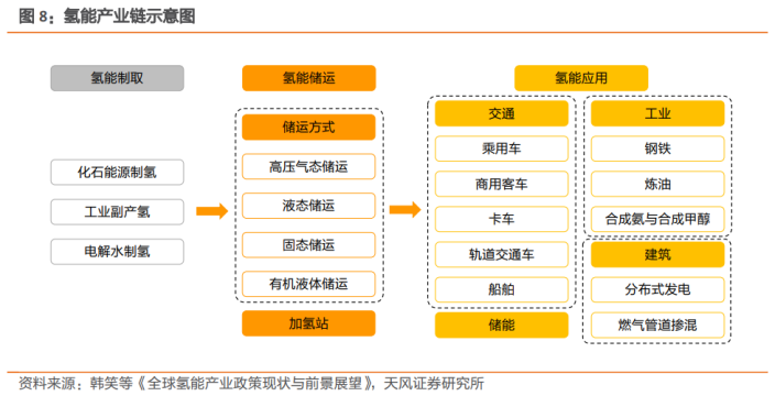 資料顯示,氫能產(chǎn)業(yè)主要有“制、儲、運、用”四大環(huán)節(jié),其中上游制取環(huán)節(jié),目前主要有化石能源制氫、工業(yè)副產(chǎn)氫和電解水制氫等方式;中游儲運環(huán)節(jié)存在氣態(tài)、液態(tài)、固態(tài)等方式,加氫站等基礎(chǔ)設(shè)施建設(shè)也是重要部分;下游應(yīng)用環(huán)節(jié),當前氫能主要應(yīng)用在工業(yè)領(lǐng)域,未來有望擴展為交通、工業(yè)、建筑、儲能等多領(lǐng)域。