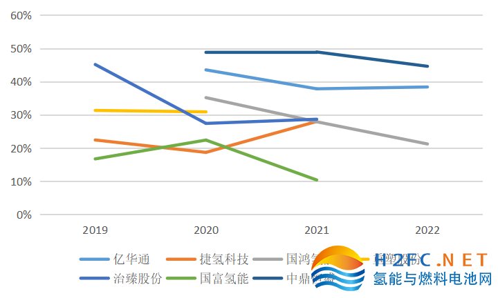 從企業的主營業務毛利率看,基本在20%以上、高者達到40%左右,可知氫能行業的毛利率高于制造業成熟行業的平均水平。而企業期間費用占營業收入比例普遍在30%以上,甚至有時超過100%,遠高于制造業成熟行業的平均水平。并且多數企業的期間費用占比大于毛利率,可以得出期間費用高是造成企業虧損的主要原因。僅有持續盈利的中鼎恒盛期間費用占比低。