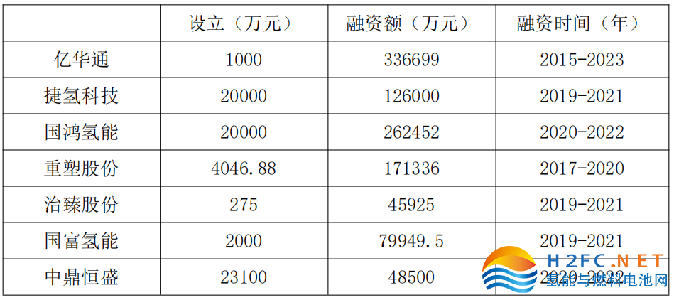 氫能企業初期的發展需要社會的不斷投入和培育。億華通在上市之前的2015-2019年間共融資近8億元,2020年8月IPO融資13.5億元,2021年定增2億元,2023年香港上市融資10.27億港元。其他企業在報告期內融資最少的也在4億元以上,多則近30億元。