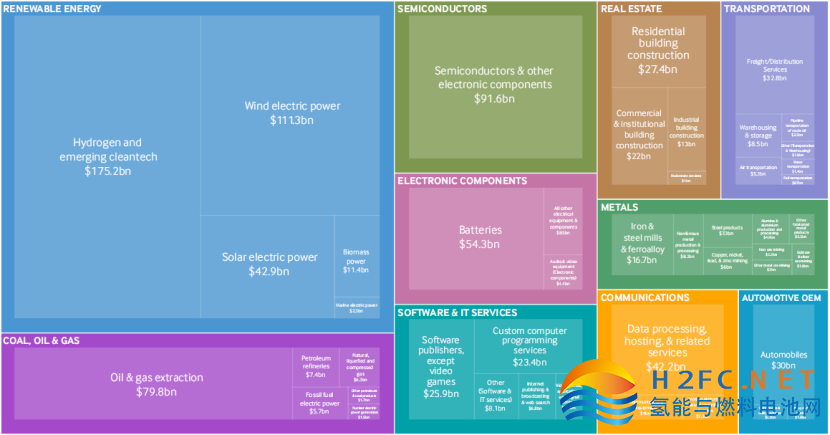 細分領域來看,氫能與新興清潔技術領域,1752億美元,占比超過50%;風能領域(1113億美元);太陽能領域(429億美元);生物質能源領域(114億美元);船用電力領域(23億美元)。