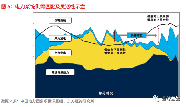 電力是一種“剛性”能源,其在不轉化為其他能量形式的條件下較難儲存,要求發電和用電要逐時刻保持一致。氫能的靈活性可以理解為其在制備和使用時間上的靈活性,也即由于氫易于儲存,制氫和用氫不需要同時發生,因此氫能與電力不同,是一種靈活性能源。隨著可再生能源的快速發展,電力系統將從過去的“電源側可調,負荷側不可控”逐漸發展為“電源負荷均不可控”,加大了電力系統實時平衡供需的難度,氫能作為一種可以由電力制取、使用過程無排放的靈活性能源,可以很好地參與到未來以電力為主的可再生能源體系中,為電力系統提供調節能力。