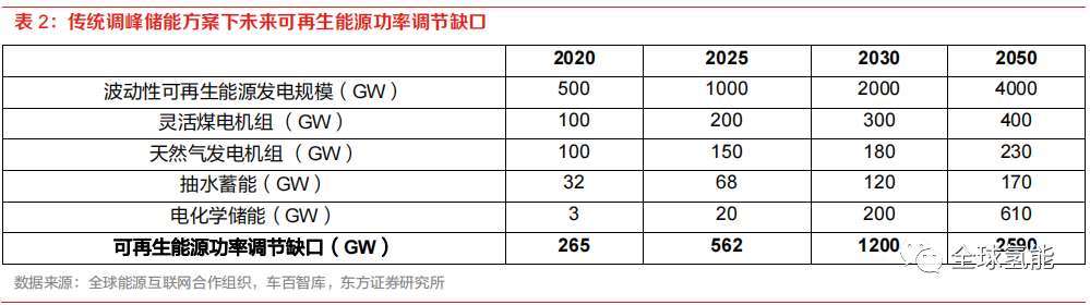 在當前儲能方案下,未來還存在大量的可再生能源功率調節缺口。根據全球能源互聯網合作組織的預測,隨著未來非水可再生能源裝機規模的增長,我國的電力系統將產生巨大的功率調節缺口,缺口主要來自于三個方面:第一,靈活性煤電機組、天然氣發電機組作為化石能源發電方式,在碳中和的目標下規模受到限制;第二,抽水蓄能受限于地理條件等因素,發展規模具有上限;第三,電化學儲能是目前快速發展的新型儲能方式,但在長周期、大規模儲能需求的應用上仍然面臨著鋰資源約束、成本偏高、安全性等問題。