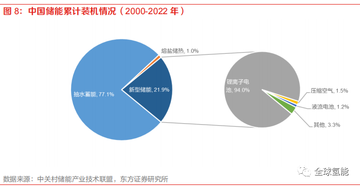 抽水蓄能和電化學儲能是目前主流的傳統儲能和新型儲能形式。目前,各類儲能方案主要可以分為熱儲能、機械儲能、電化學儲能、電磁儲能以及化學儲能等幾大類。其中機械儲能中的抽水蓄能是當前最主要的傳統儲能方式,占到中國儲能裝機總量的77%,在新型儲能中鋰離子電池是當前最主要的方案,占到了新型儲能裝機的94%左右。
