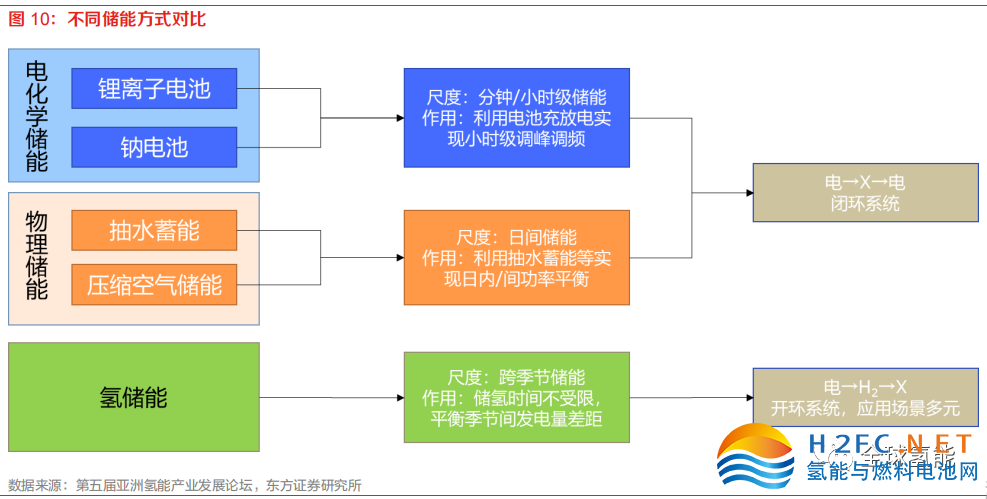 從應用場景上來看,其他儲能方式一般為電→X→電的閉環系統,也即最終能源還需要以電力的形式進行輸出。而氫作為一種燃料和化工原料,在下游有豐富的應用場景,可以實現電→H2→X的開環儲能模式,也即由電制取的氫可以直接面向不同場景進行應用,具有更高的場景靈活性,也可以避免更多的轉換環節以提高儲能效率。