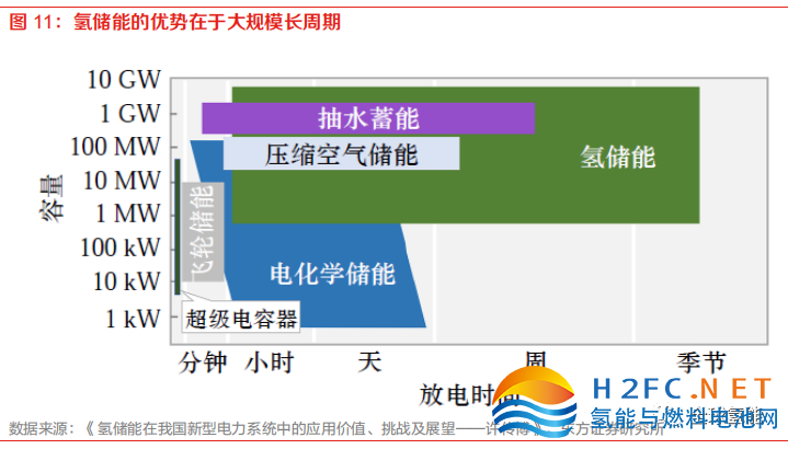 而氫儲能則是一種更適合于長周期大規模場景的儲能方式,可以實現跨季節的儲能,這一方面得益于相比于電池的自放電、水的蒸發耗散,氫作為一種穩定的化學品更適合長時間的儲存,因而更適合跨季節的長周期儲能,另一方面,氫儲能在大規模的儲能場景下也更具經濟優勢,氫儲能的制儲部分主要由制氫系統(功率)和儲氫系統(容量)分別構成,可以實現儲能功率與儲能容量的解耦,因而在長時間、大規模的儲能場景下,氫儲能容量的增加主要依靠擴大儲氫系統的容量,可以實現更低的規模化成本;相比電化學儲能受到蓄電池原理的約束,功率和容量耦合,在大規模儲能的場景下規模化降本的潛力較小,所需的成本較高。有研究表明,規模化儲氫比規模化儲電的成本要低一個數量級。