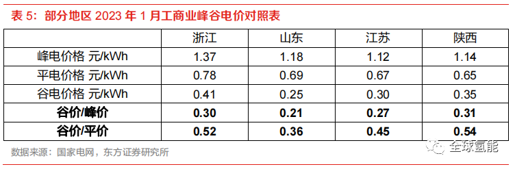 以目前各地區的峰谷電價為例,如浙江、山東、江蘇、陜西等地的谷電價格僅為平時電價的1/2左右,峰時電價的1/3左右。價差最大的山東,其谷時電價僅為平時電價的1/3,峰時電價的1/5。