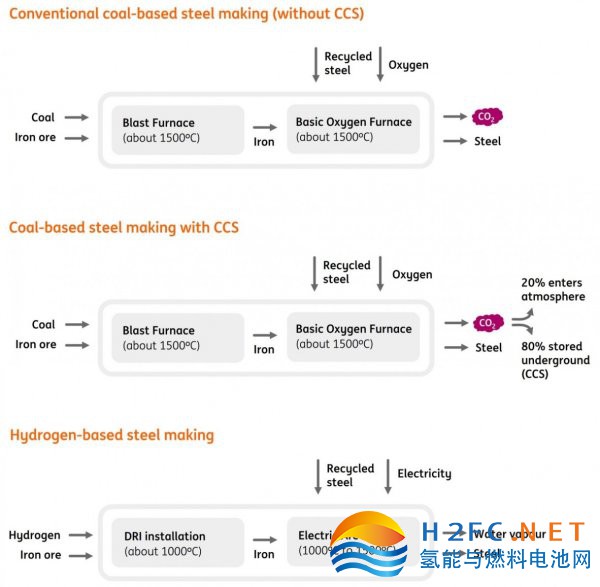 煤基煉鋼和氫基煉鋼的三種鋼鐵生產技術是本文的中心:
