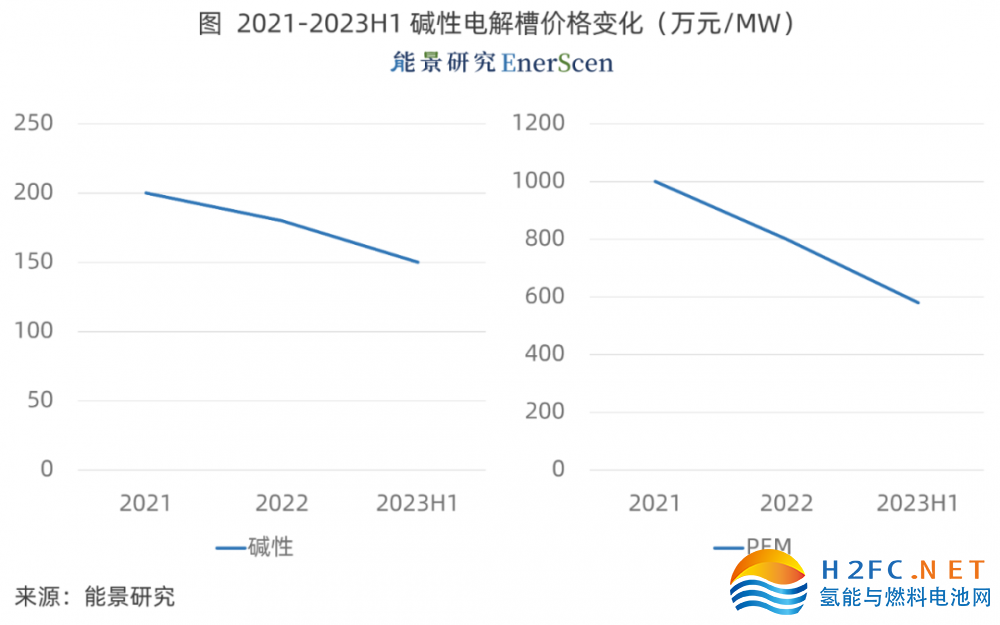 2022年PEM電解槽的平均價格約為800 萬元/MW;2023年上半年平均價格約為580萬元/MW,較2022年下降27.5%。