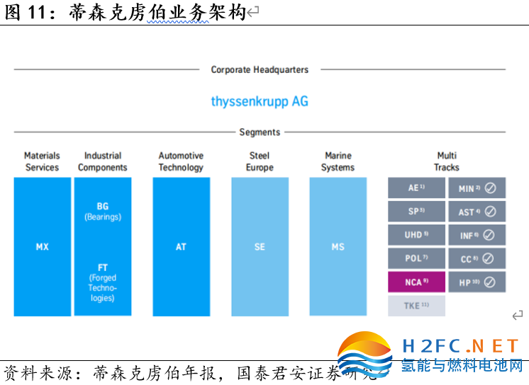 從業(yè)務(wù)架構(gòu)看,歐洲主流電解槽廠商中ITM Power專注于電解槽業(yè)務(wù),NEL、McPhy、Plug Power在電解槽業(yè)務(wù)外還布局加氫站或燃料電池業(yè)務(wù),蒂森克虜伯業(yè)務(wù)涉及范圍最廣,氫能電解槽業(yè)務(wù)已作為獨(dú)立子公司Nucera上市。從技術(shù)路線看,ITM Power、Plug Power以及Siemens專注PEM電解槽,McPhy和Nucera專注堿性電解槽,NEL在堿性和PEM兩條技術(shù)路線均有布局。
