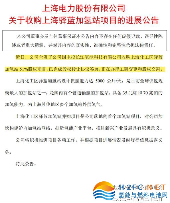 5月22日,上海電力(600021)公告稱,公司全資子公司國電投長江氫能科技有限公司收購上海化工區驛藍加氫站51%股權項目,已完成股權轉讓協議簽署,正在辦理工商變更和股權交割。
